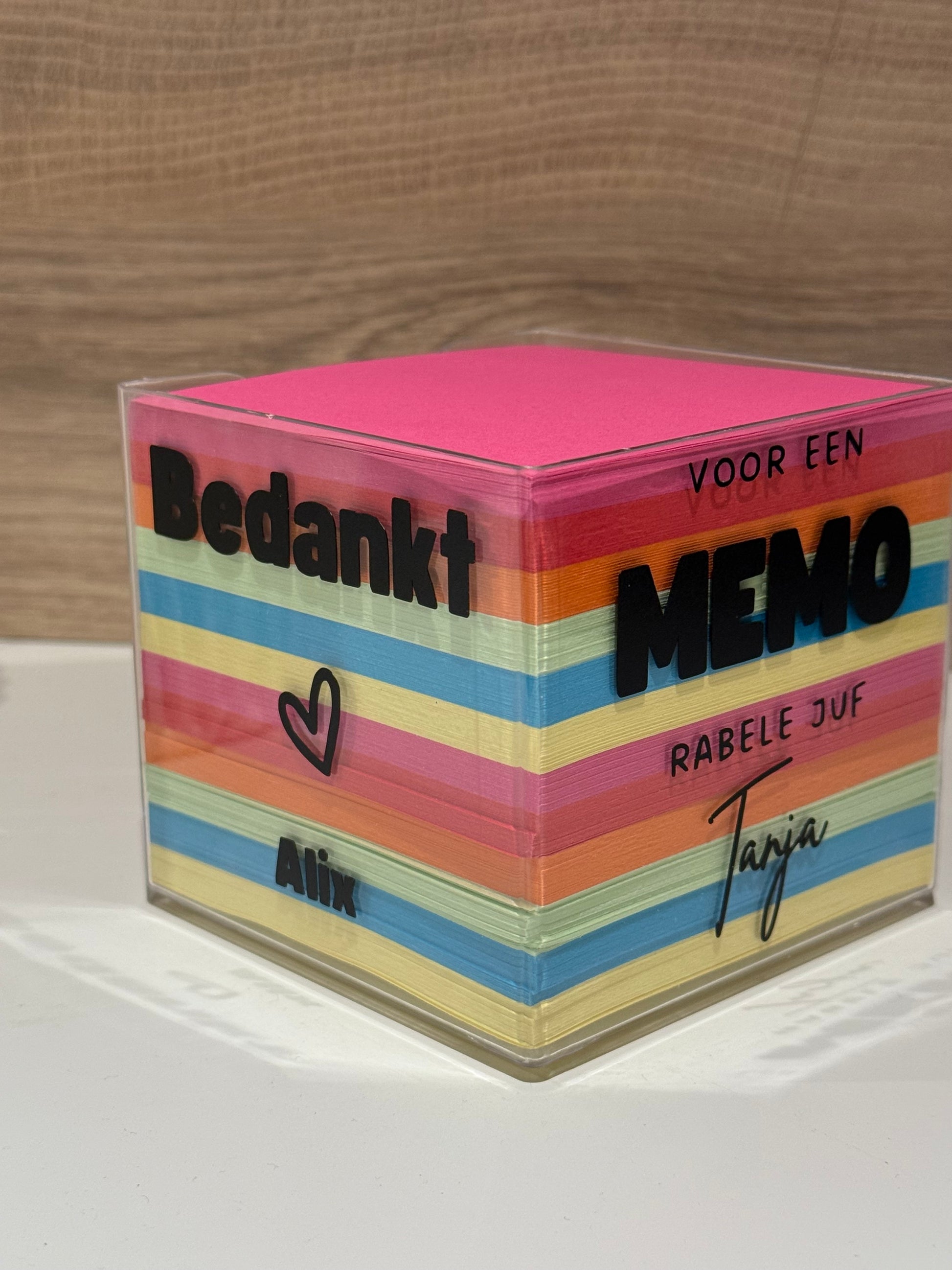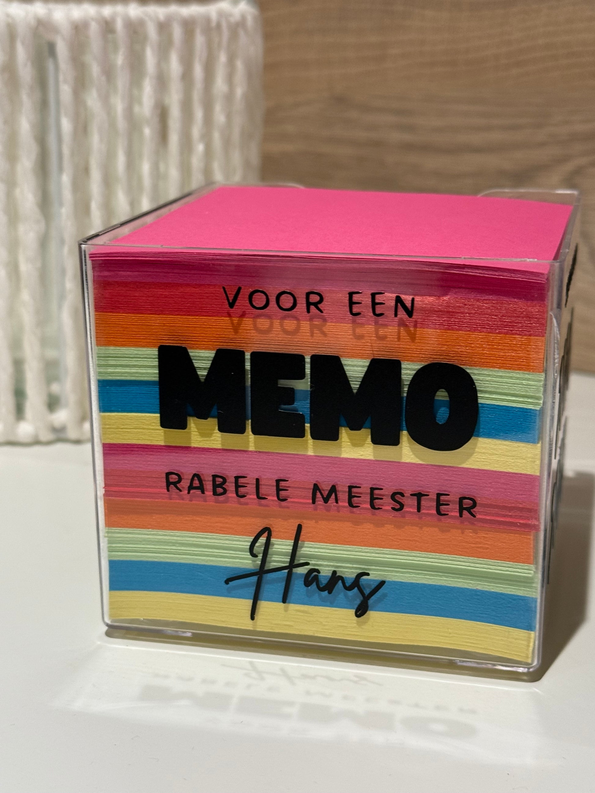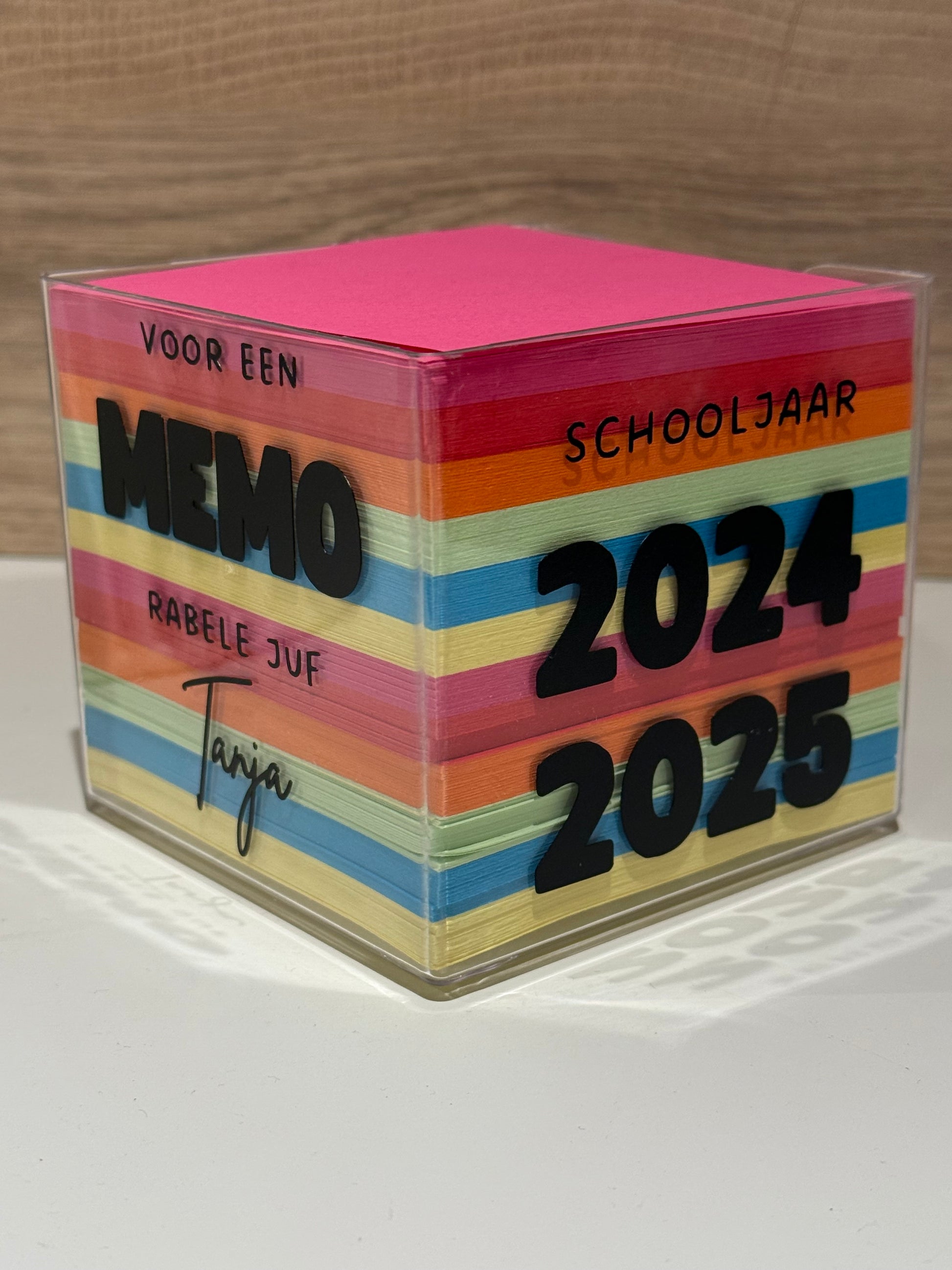 Een kleurrijk en praktisch cadeautje voor een onvergetelijke juf of meester! Deze blok memoblaadjes in regenboogkleuren zit in een plastiek houder en wordt gepersonaliseerd met naam van de juf, je bengel en het huidig schooljaar. Een vrolijk en blijvend aandenken voor op het bureau – handig én hartverwarmend.